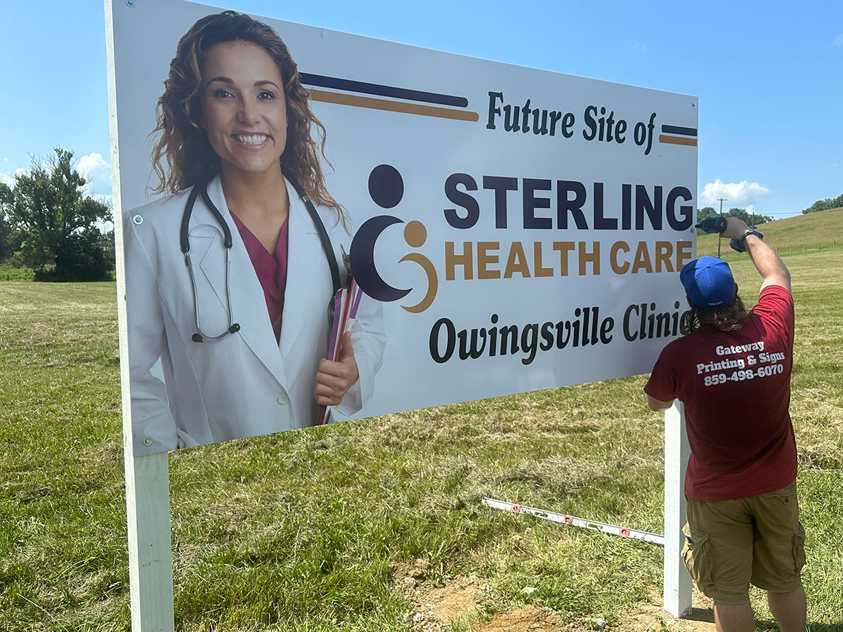 June 25, 2025 - The first sign installation at Sterling Health Care’s future clinic in Owingsville took place Tuesday, June 25, with placement happening across from Save A Lot supermarket located at 78 Creek Side Drive. Crews from Gateway Printing and Signs paused operations due to the extremely high temperatures, then completed installation of the final two signs closer to KY-36 roadway on Wednesday morning.