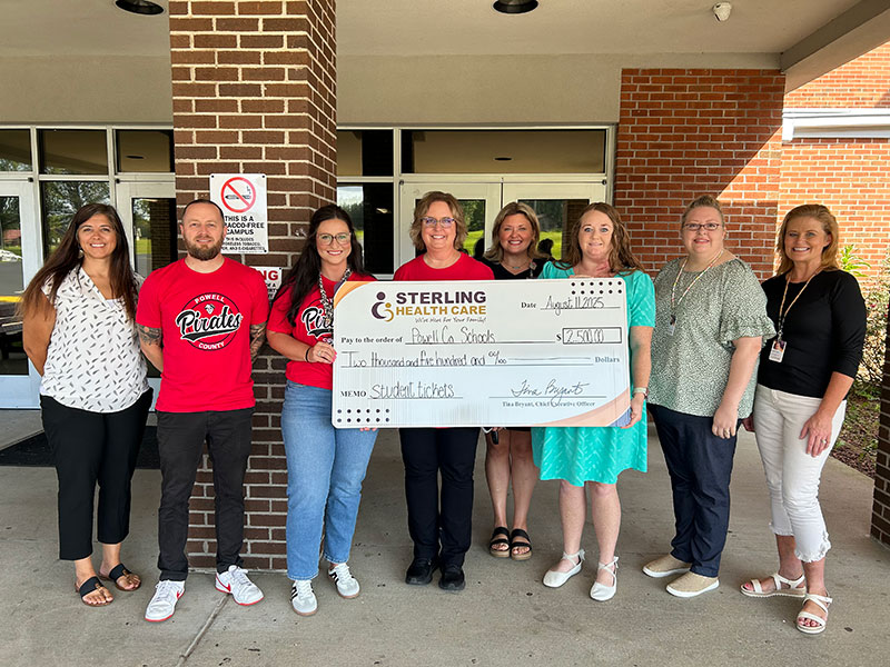 Sterling Health Care (SHC) presented a check for $2,500 to Powell County Schools (PCS). From left are Angel Rogers, SHC School-Based Health Coordinator; Josh Crowe, Dean of Students; Meghan Mays, Athletic Director; Sarah Wasson, Superintendent; Katie Clevenger, Licensed Professional Clinical Counselor; Amanda Miller, Licensed Clinical Social Worker; Amy Holder, CMA; and Sarah Crabtree, APRN.