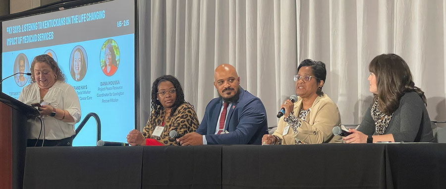 Tiffany Taul-Scruggs, Patient Service Outreach Coordinator for Sterling Health Care, speaks on the impact of Medicaid services at the 2023 Kentucky Voices for Health Annual Meeting.