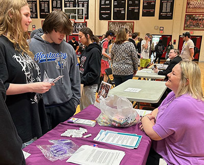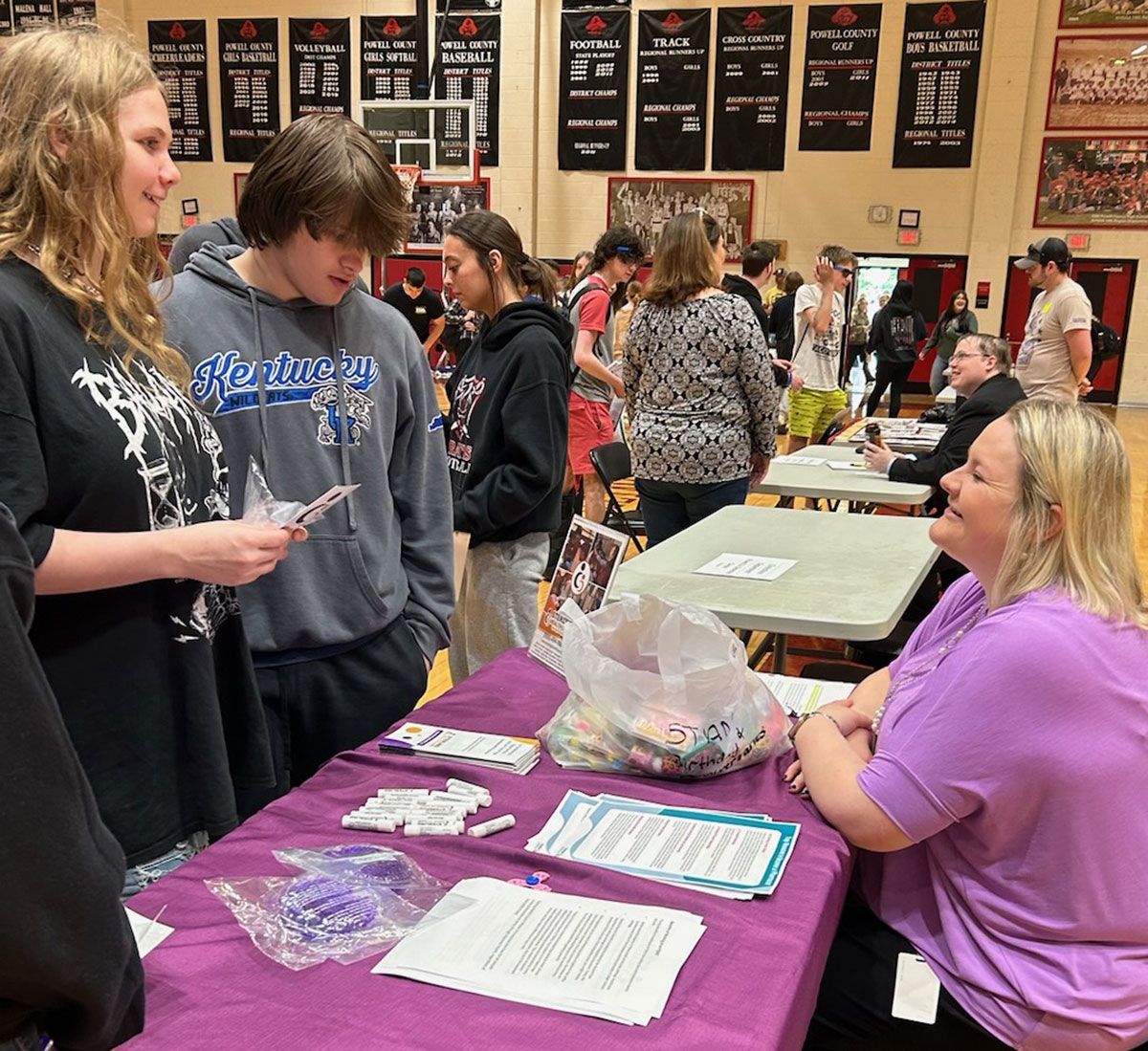 Members of Sterling Health Care’s (SHC) Stanton clinic team made an appearance at the Powell County High School Trade Fair last Friday. SHC’s Laura Rogers, pharmacist, and Brenda Johnson, receptionist, met with local students in the high school gym to discuss career options and the services that SHC provides. Rogers can be seen above interacting with a group of students at SHC’s booth.