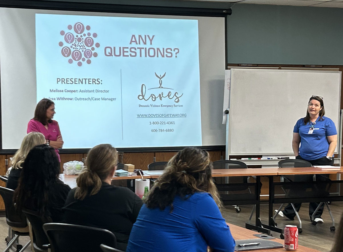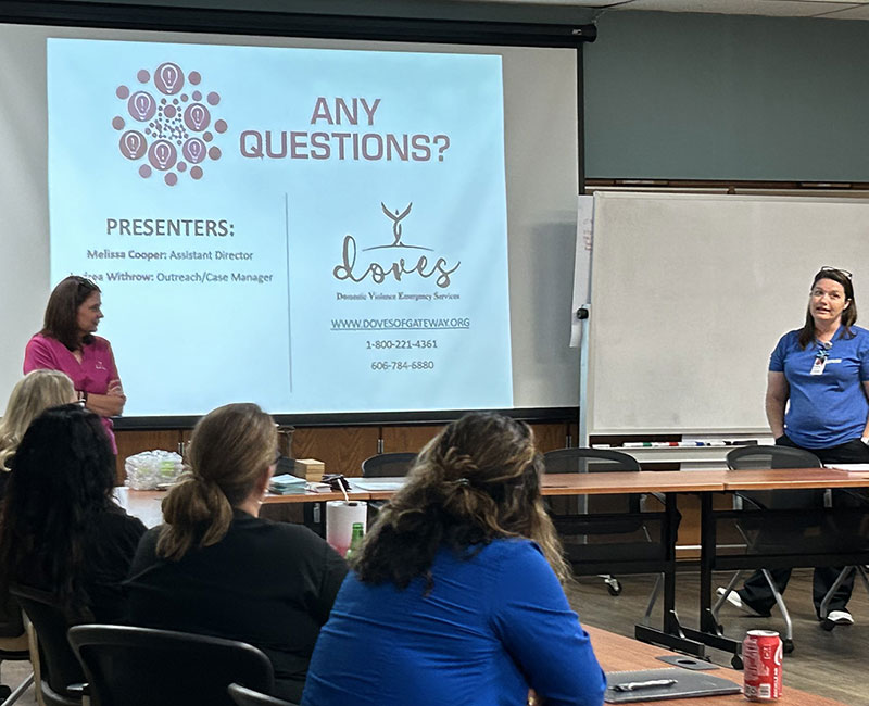 Several members of Sterling Health Care’s (SHC) outreach team attended a presentation made by the Domestic Violence Emergency Services (DOVES) of Gateway organization held on June 3 at the administration building. Attendees heard from presenters Andrea Withrow and Melissa Cooper, who spoke on types of abuse, how to recognize signs of domestic violence in patients, and how to provide resources to these patients. The outreach team also heard from SHC’s Aleisha Poole, who spoke on her own experiences with domestic violence. Poole is pictured above, discussing the importance of raising awareness on the subject and the importance of the DOVES program in helping her safely escape her situation.