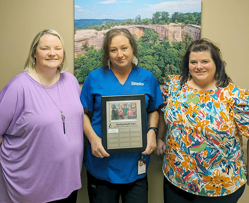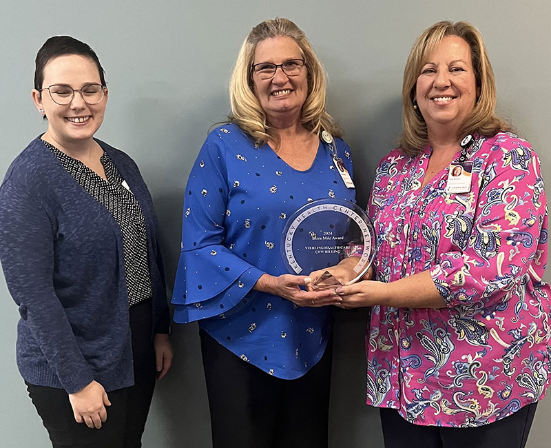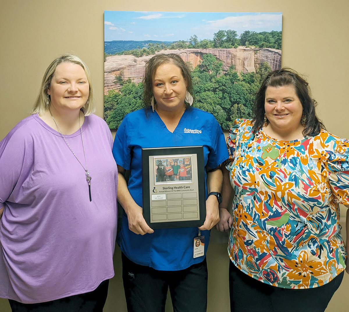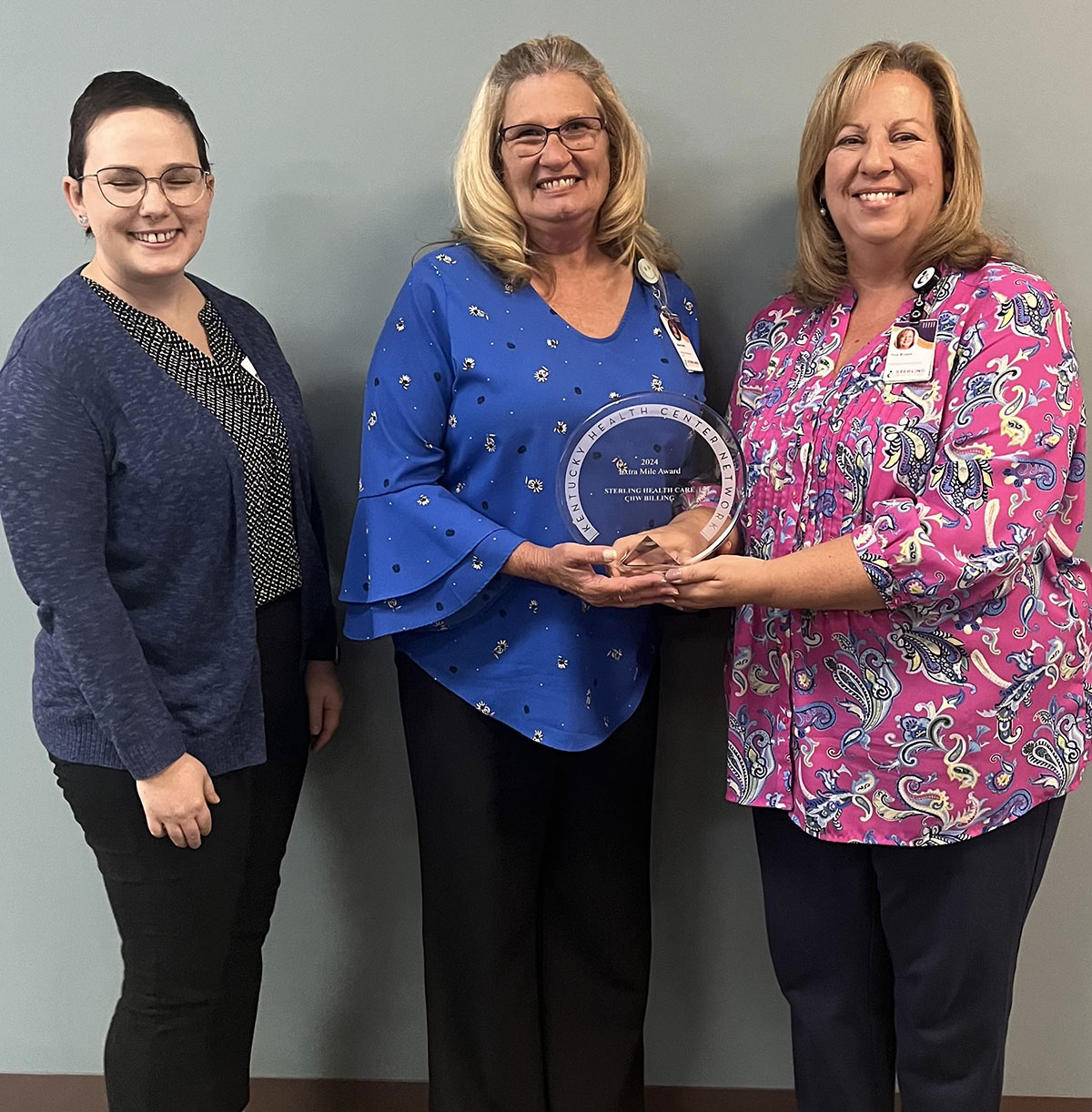 The Kentucky Health Center Network (KHCN) recognized the work of Sterling Health Care (SHC) and its efforts in CHW Billing with a surprise awards presentation earlier this week. Dawn Craft, Director of Revenue Cycle, and Tina Bryant, Chief Executive Officer, are pictured accepting the 2024 Extra Mile Award from Lindsay Nelson, KHCN Chief Operating Officer, who expressed her appreciation for SHC’s work. Not pictured is Tiffany Taul Scruggs, SHC Patient Service Outreach Manager, who was instrumental in the CHW billing work with KHCN.