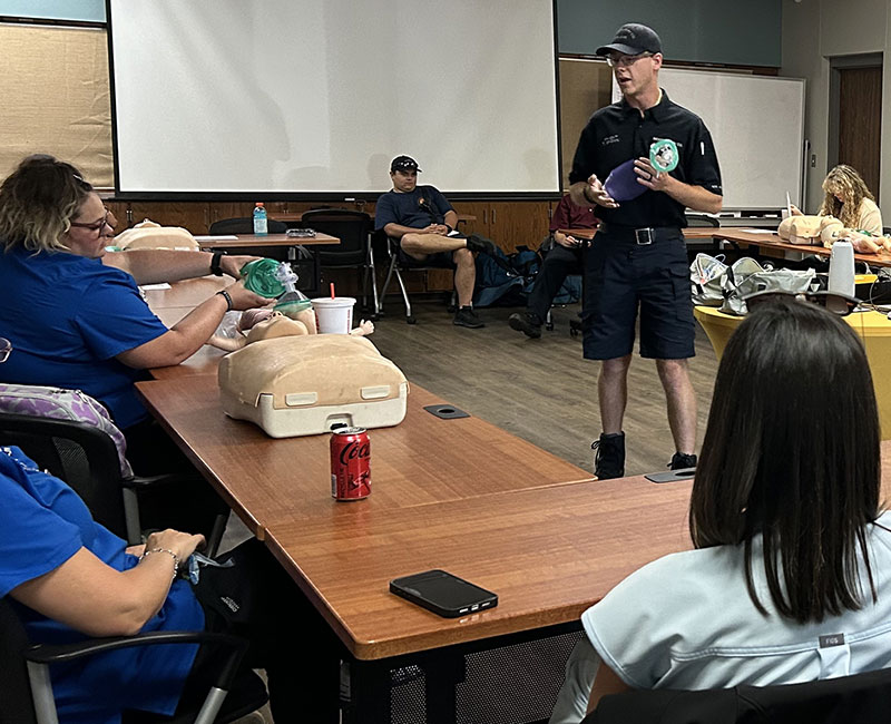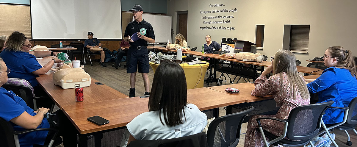 Several Sterling Health Care (SHC) employees gathered at the administration building last week for a cardiopulmonary resuscitation (CPR) recertification class held by the Montgomery County Fire/EMS department. The group is pictured above, learning about proper CPR techniques, AED usage, and proper usage of bag valve masks.