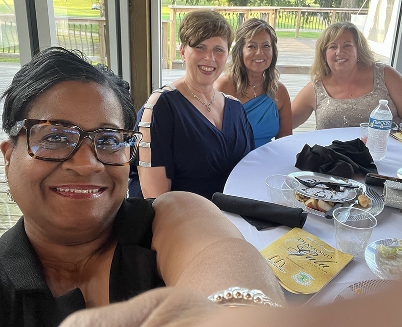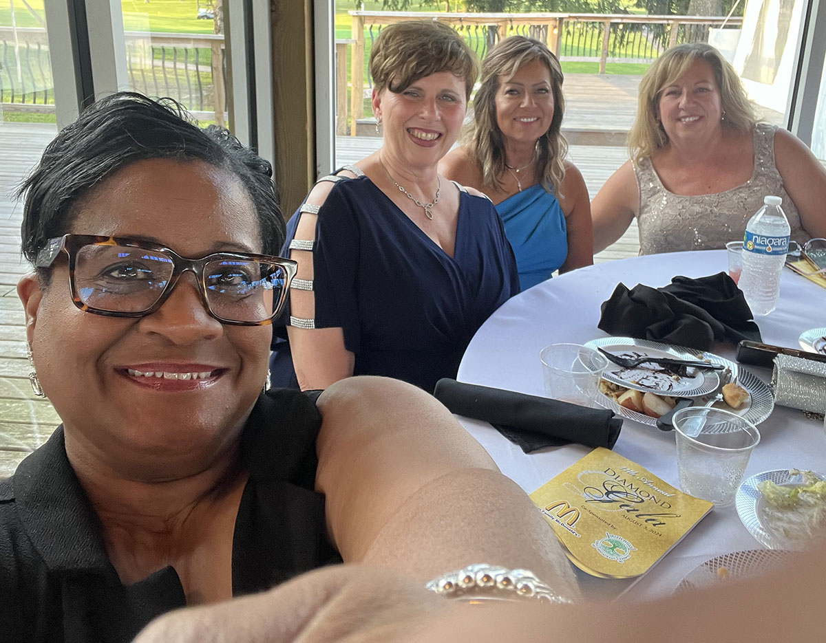 Several representatives from SHC joined the community in gathering for the 11th Annual Diamond Gala, hosted by the Kiwanis Club of Mount Sterling. The event took place at the Irish Hills Golf, Restaurant and Event Venue, where attendees enjoyed dinner, music, and dancing throughout the night. The selfie-taking skills of SHC’s Tiffany Taul-Scruggs were on display as she took this group photo at the organization’s table. Pictured, from left, are Tiffany Taul-Scruggs, Patient Service Outreach Coordinator; Donna Raper, Chief Administrative Officer; Shelia Logan, Executive Assistant; and Tina Bryant, Chief Executive Officer. Also attending the gala but not pictured were Mindee Hudson, Chief Operating Officer, and Jeff Pinkerton, Marketing and Communications Manager.