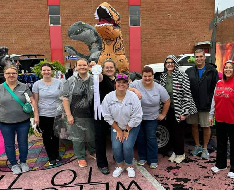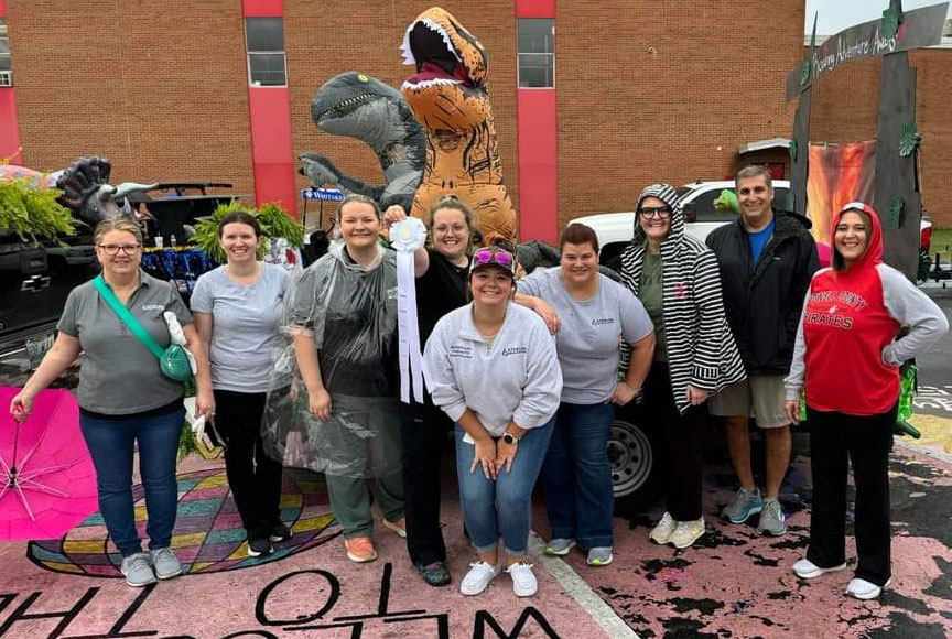 Employees of Sterling Health Care’s (SHC) Stanton location took home a third place ribbon for their “Dino-mite” themed float in the Powell Co. Lions Club Fair held on Friday, Sept. 13. After the parade, SHC provided more fun at the Lions Club fair, allowing those in attendance a chance to win a variety of items, including an Amazon Fire tablet, through SHC’s new Prize Drop game. The SHC-Stanton team is pictured above with their prize ribbon and float. From left are, Holly Brewer, Katrina Turner, Laura Rogers, Jessica Poe, Rebecca Fraley, Brandy Phillips, Jennifer Fitzpatrick, Troy Brooks, and Samantha Willoughby. Crystal Watkins and Lissie Allen can be seen in the dinosaur costumes behind the group.