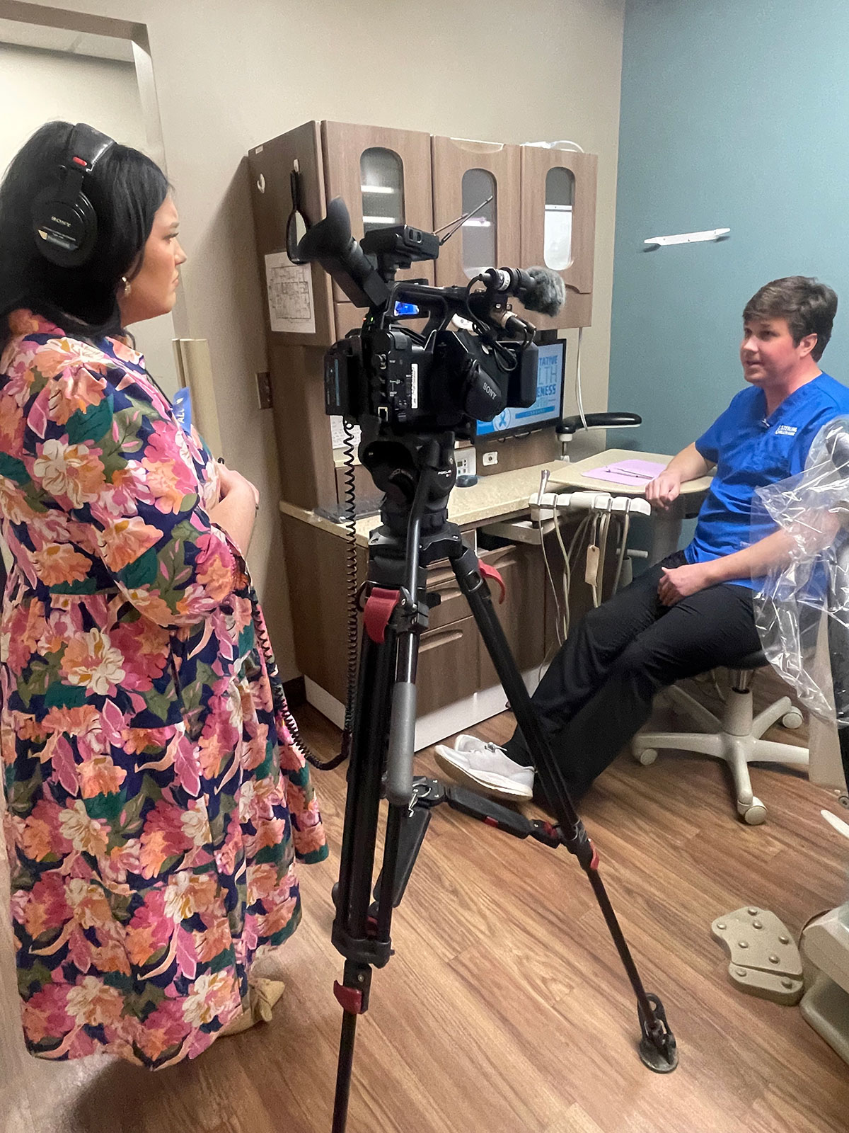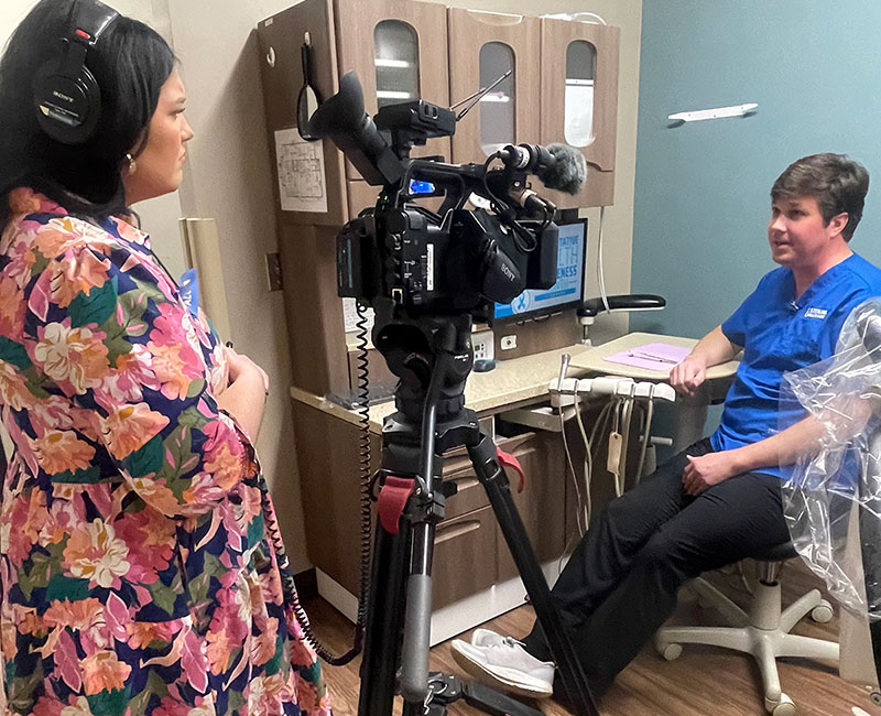 Popular local news station WKYT made a visit to Sterling Health Care’s (SHC) Montgomery Dental Center on Wednesday, Feb. 26, to discuss children’s dental health. Dr. Nathan Rusher, SHC Director of Dentistry Services, met with WKYT’s Alyssa Williams and explained various factors that can lead to cavities. Rusher and Williams are pictured above during the interview.