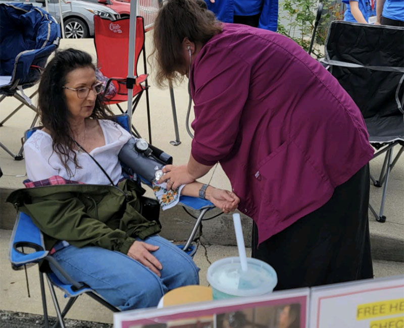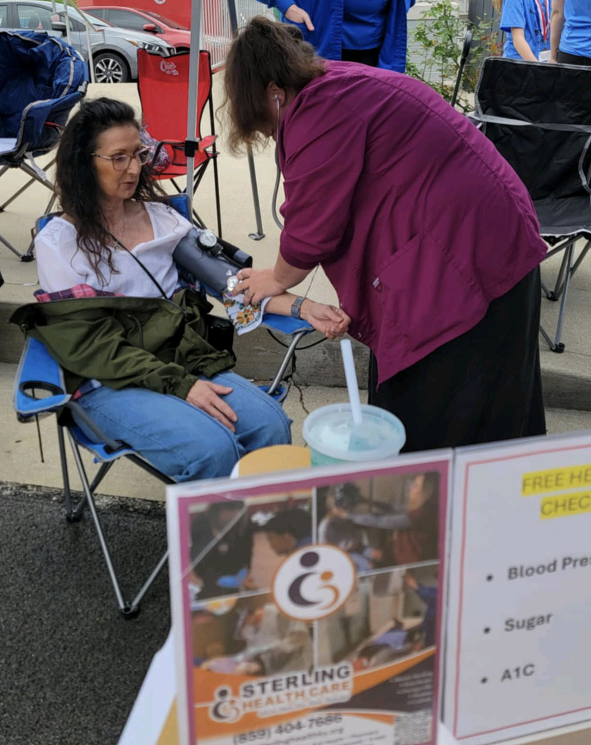 Members of the Sterling Health Care (SHC) team in Stanton took a trip to Irvine last Saturday for the 33rd Annual Mountain Mushroom Festival. SHC was one of several vendors in attendance at the event, offering a variety of information and services to visitors. Those who stopped by SHC’s booth had the opportunity to receive health checks for their blood pressure levels, blood glucose levels, and A1C levels. Attendees could also enter for the chance to win an electric neck fan, as well as an SHC laptop bag. Pictured above is Brandy Perdue, Certified Medical Assistant at the Stanton clinic, providing a blood pressure check to one of several attendees at the event. The SHC team is pictured above left, ready to greet visitors to the booth.
