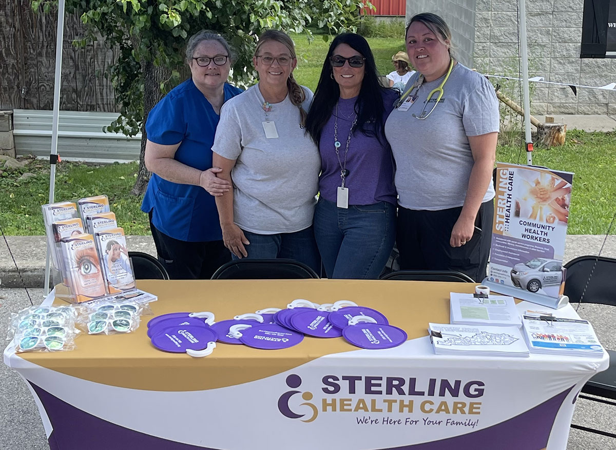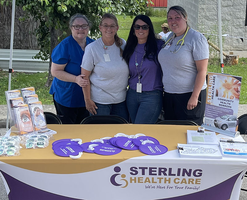 Several Sterling Health Care (SHC) employees greeted attendees of the weekend-long Menifee Mountain Memories Festival in Frenchburg, beginning on Friday, June 6. Those who attended the festival from noon to 4:30 p.m. on Friday could stop by the SHC table to enjoy conversation with employees and receive a variety of informational and promotional items. Pictured above, from left, are Sandy Martin, Care Coordinator; Sheila Campbell, Community Health Worker (CHW); Tammy Curtis, CHW; and Lorena Damron, Certified Medical Assistant with SHC’s school-based health program in Montgomery Co. Schools.