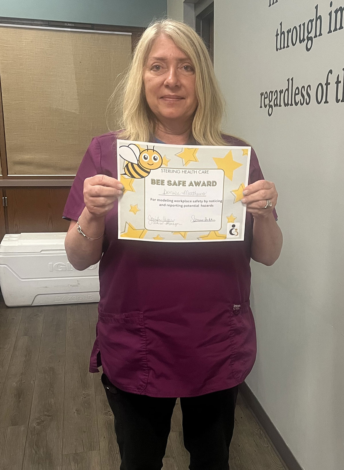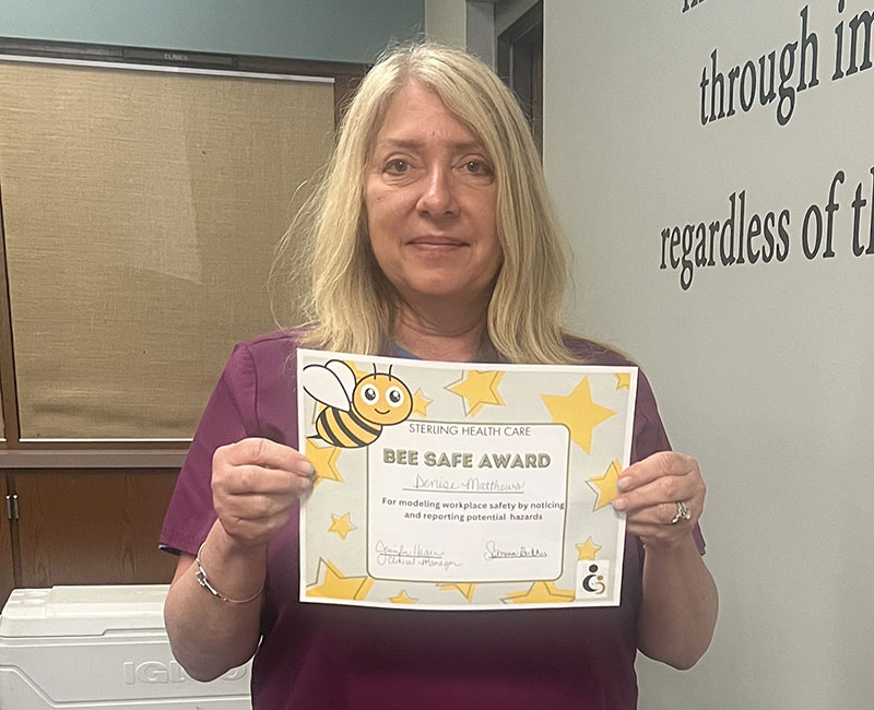Denise Matthews, Radiation Technician at Sterling Health Care’s Carlisle location, was a recent winner of the SHC Safety Committee Bee Safe Award. Matthews noted an abnormality on a recent x-ray that had a normal result and she asked for a re-read of the film. Once reviewed, it was revealed that there was a fracture that was missed due to technical error found with a result template. The award was given at SHC’s Quarterly Safety meeting on July 16th.