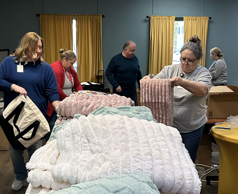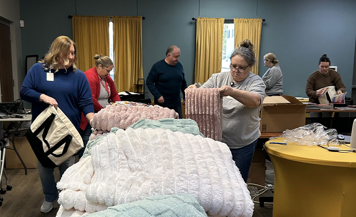 Several Sterling Health Care (SHC) employees gathered at the SHC Administration to put together gift bags for local breast cancer patients. The bags featured a variety of items and activities for those who receive them, including self-care items, head scarves, and comfort items such as blankets and pillows. SHC is partnering with CHI Saint Joseph Health in Mount Sterling, as well as with other local organizations, to distribute these gifts and impact the lives of patients within the Gateway Region. Employees can be seen above as they prepared and filled bags for the project.