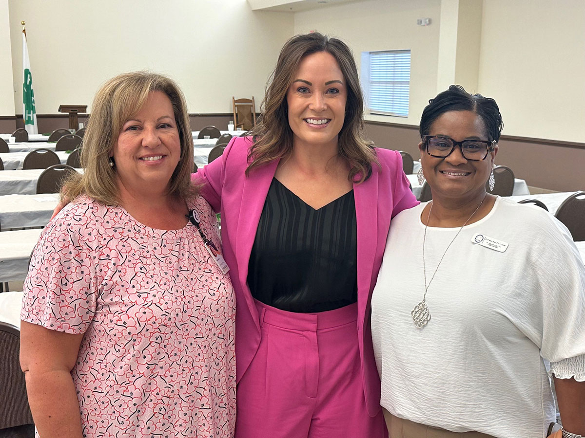 June 13, 2024 - Several members of SHC management joined the Mount Sterling-Montgomery County Chamber of Commerce for its Annual Chamber Membership Breakfast. The event, held on Thursday, June 13, featured several local and state officials, including Mayor Al Botts and Lieutenant Governor Jacqueline Coleman. Coleman joined Rocky Adkins, Senior Advisor to Governor Andy Beshear, in discussing Kentucky’s economic growth and record-breaking travel tourism. Following the breakfast, SHC joined the Chamber at the groundbreaking ceremony for the Walters Industrial Park. Senator Greg Elkins joined Botts, Coleman, and Adkins on the list of guest speakers for the ceremony, speaking on the growth of the city and the impact of the industrial park. In attendance from SHC were Tina Bryant, Chief Executive Officer; Flo Mahoney, Chief Financial Officer; Jeff Pinkerton, Marketing and Communications Manager; and Tiffany Taul-Scruggs, Patient Service Outreach Coordinator. Bryant can be seen below with Lt. Gov. Coleman and Taul-Scruggs.